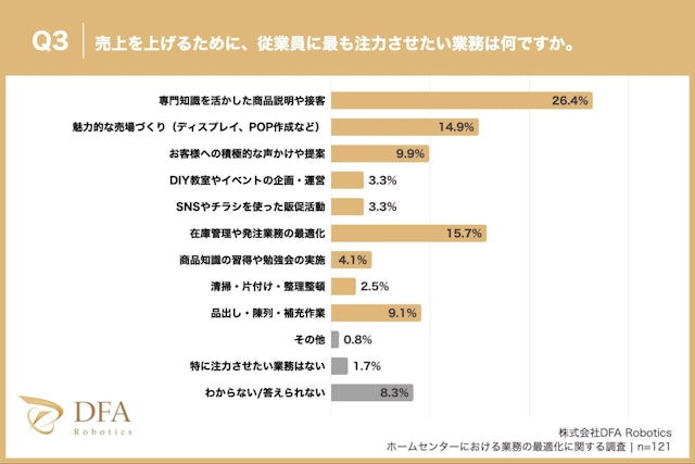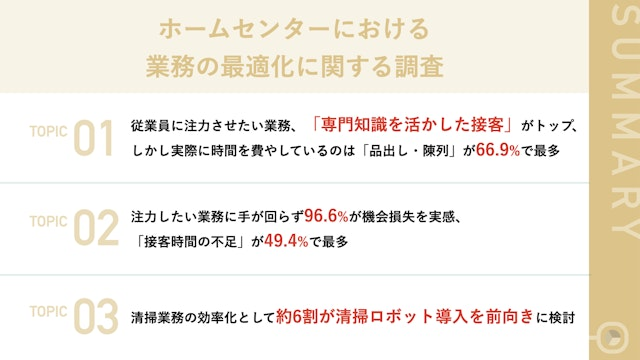 ホームセンターの業務実態、品出しなど日常業務に約7割が時間を費やす一方で注力したいのは「専門接客」。専念したい業務の乖離に96.6%が機会損失を実感