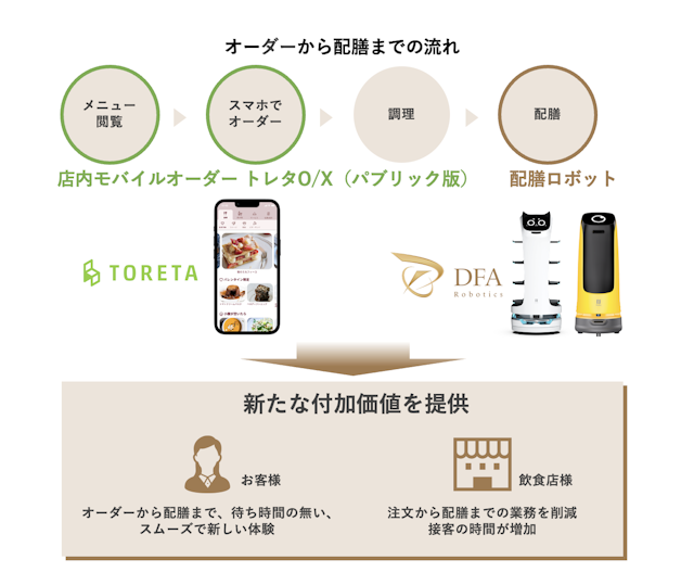 トレタO/X(パブリック版)とDFAロボットプラットフォームが連携し、飲食店のオーダーから配膳までの業務DXを実現 トレタとDFA Robotics「次世代 外食DXプロジェクト」始動!