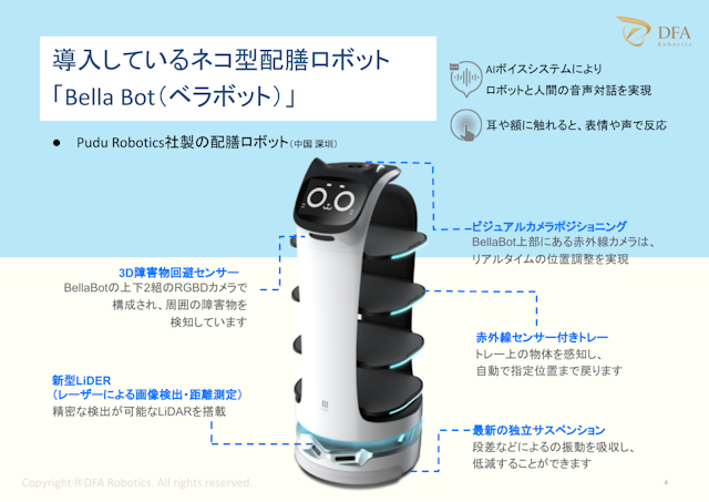 飲食店DXを推進するロボティクスソリューションカンパニーである株式会社DFA Robotics(本社:東京都渋谷区、代表取締役社長:波多野 昌昭)は、提携するPudu Robotics社(本社:中国深セン、日本法人Pudu Robotics Japan 株式会社 代表取締役社長:張涛)が提供するネコ型配膳ロボット「BellaBot(ベラボット)」において国内最多となる10台稼働を実現し、千葉県富津市の食事処「漁師料理 かなや」にて、報道関係の皆様に向けたお披露目会を3月14日(火)に開催したことを報告いたします。