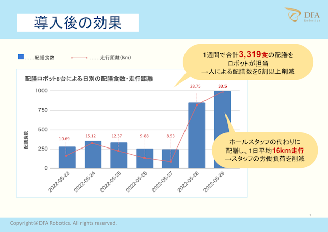 DFA Roboticsは、「次世代の社会インフラの創造」をビジョンに掲げ、最先端ロボットによる世界中の「ヒト」と「ビジネス」の価値向上を目指す企業です。2021年11月より本格的に配膳ロボット事業へ参入し、約1年で3,250台以上を全国に導入。豊富な設置・導入の知見とアフターサポート力が特徴です。