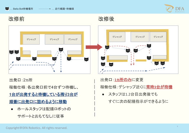2022年12月にはさらなる業務効率向上のため、調理場の改修を行い、複数台のロボットがデシャップ前で待機できるように通路を拡張。これまで客席横で待機していた配膳ロボットの元へと料理を運んでいましたが、スタッフは調理場から離れず業務が可能となり、ロスタイムのない店舗運営が可能となりました。結果、店舗改修前の平均配膳食数272食から、店舗改修後は316食と効率的な店舗運営を実現しました。