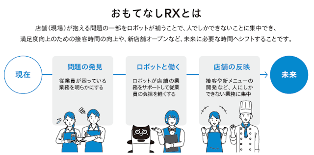 「おもてなしRX©」とは、人でしかできない(人がやりたい)業務以外をロボットが補うことで、満足度向上のための接客や、新メニュー開発などの、人にしかできない業務に集中するための取り組みです。
