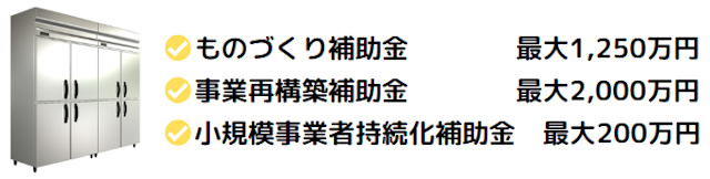 業務用冷蔵庫、配膳ロボット、食品加工機械、急速冷凍機、ECサイト構築費用等様々な経費が補助金を活用してお得に利用できる可能性もあります。