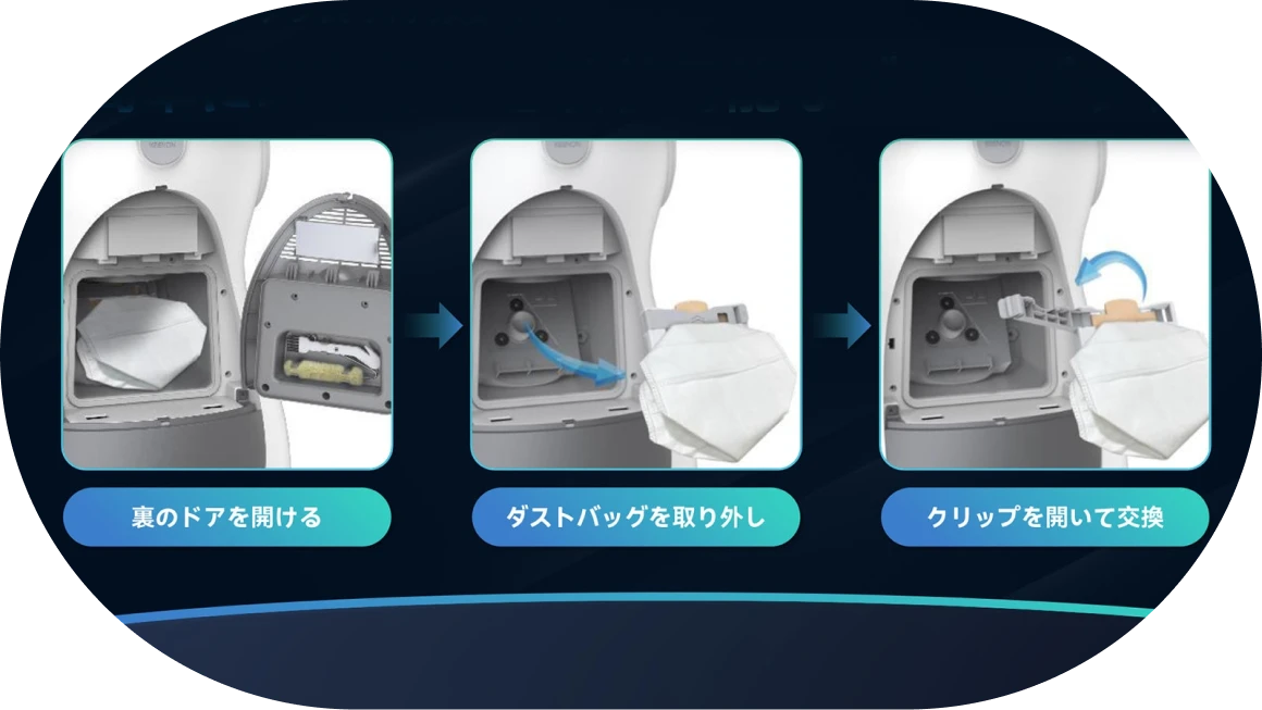 3.5Lもの大容量ダストボックスを内蔵しているので、1日8時間稼働しても2週間に1回のゴミ捨てで済みます。ダストバッグは簡単に取り外しと装着が可能で、日々のお手入れもラクラク。また、ゴミの交換が必要な際は、ロボットから自動的に通知されるため便利です。