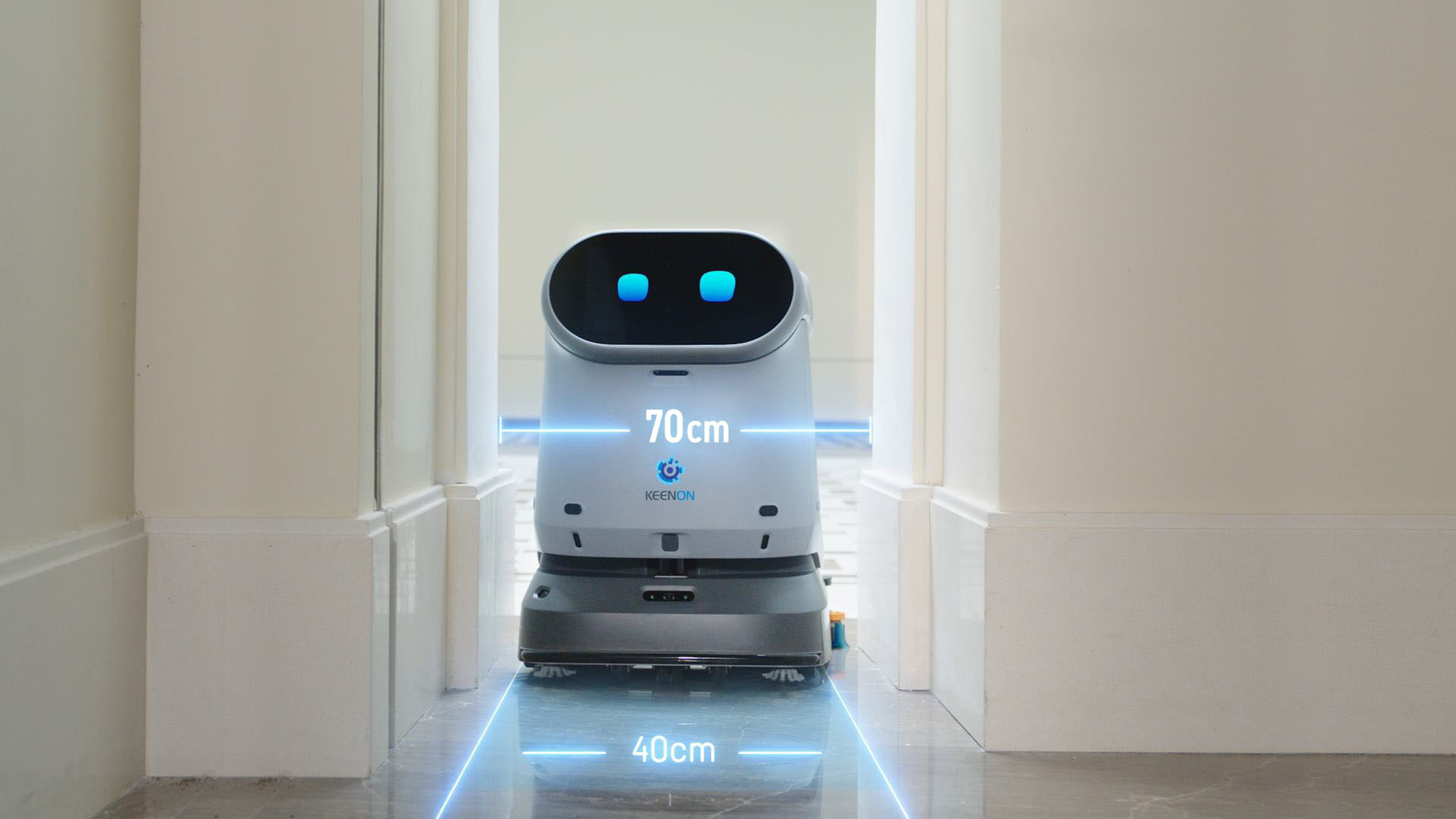 「KEENON C40(キーノン シーフォーティー)」は、病院や介護施設、オフィス等に最適な業務用清掃ロボットです。1台で吸引・水拭き・掃き・乾拭きの4役を完全自動化し、清掃業務の効率化を図ります。吸引と水拭きでブラシの交換が必要なく、ゴミ捨てや汚水の排出も簡単でメンテナンス性が高いのが特徴です。最小通過幅は65cmと、狭い通路も走行可能。水残りもなく、清掃品質の維持に寄与します。