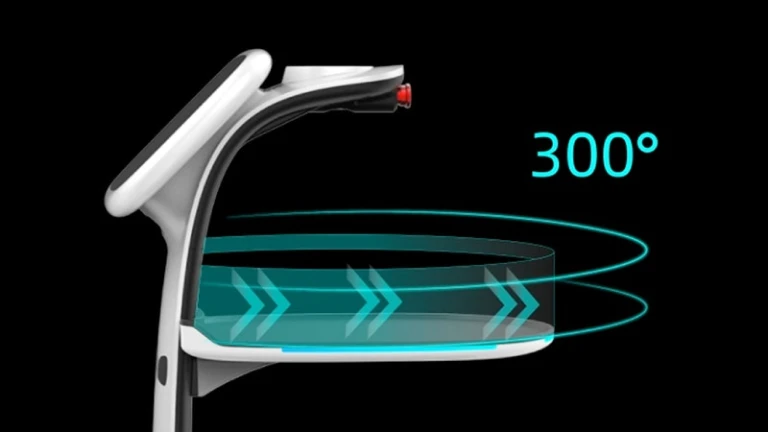 ロボット、テーブル、お客様がどのような位置関係でも受け取りやすいよう、料理の受け取りを最大300°からできるデザインを実現しました。